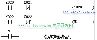 在继电控制中,点动是采用复合按钮实现的,利用复合按钮的先断后合功能可以实现点动。从继电控制转换成梯形图,只要修改一下,如下图梯形图程序就可以实现点动加连动运行的功能。当X22断开时,M1比Y20后断,X22的常闭触点阻止了Y22的自锁通路。