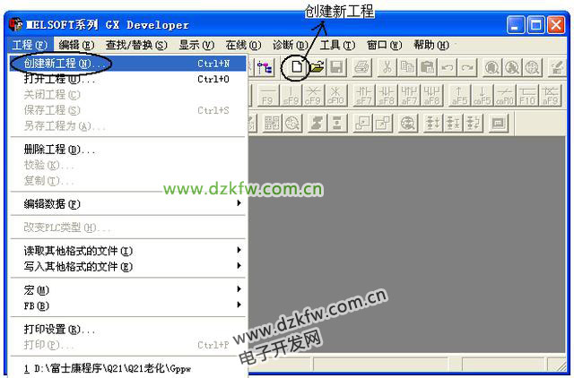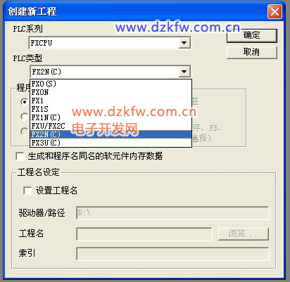 在工程菜单中选择“创建新工程”,或选择快捷图标,如上图所示,选中后会弹出如下图画面,先在PLC系列中选出你所使用的程控器的CPU系列,如在我们的实验中,选用的是FX系列,所以选FXCPU,PLC类型是指选机器的型号,我们实验用FX2N系列,所以选中FX2N(C)。设置项目名称项既为工程命名,也可以不选,在工程要关闭之前对其保存及命名。