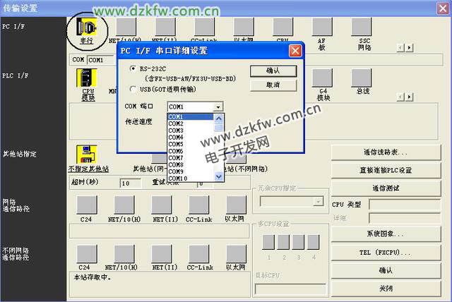 当使用USB通信线连接电脑和PLC时,通常电脑侧的COM口不是COM1,此时在电脑属性的设备管理器中,查看所连接的USB串口,然后在上图所示的“COM端口”中选择与电脑USB口一致,然后“确认”。