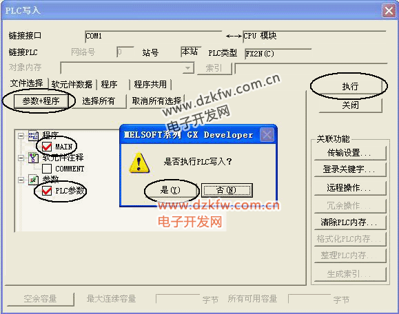 首先在画面中选择“参数+程序”,点击后,在下面的程序及参数框内,会自动打上红色“√”,说明程序及参数已选中了(若要取消选中的,则点击一下已选择“√”),传输时,PLC会自动把程序及参数进行传输。