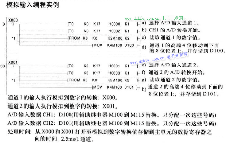 答:下例是将外部的模拟量信号转换为数字量后存入D100内。X1是通过1通道转换。X2是通过2通道转换。其中划线部分是由编程者来决定的。如D100和M100。可以更换为D0--D79999之间任意一个,M同样是。其它部分的格式是固定的。这样就完成了转换。