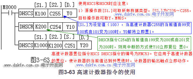 1高速计数器置位指令HSCS DHSCS指令的编号为FNC53。它应用于高速计数器的置位,使计数器的当前值达到预置值时,计数器的输出触点立即动作。它采用了中断方式使置位和输出立即执行而与扫描周期无关。如图3-63所示,[S1.]为设定值(100),当高速计数器C255的当前值由99变100或由101变为100时,Y0都将立即置1。