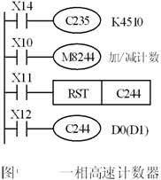 图1中的C244是1相带起动/复位端的高速计数器,由表1可知,Xl和X6分别为复位输入端和起动输入端,它们的复位和起动与扫描工作方式无关,其作用是立即的和直接的。如果X12为ON,一旦X6变为ON,立即开始计数,计数输入端为X0。X6变为OFF,立即停止计数,C244的设定值由D0和D1指定。除了用Xl来立即复位外,也可以在梯形图中用复位指令复位。