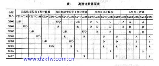 表1给出了各高速计数器对应的输入端子的元件号,表中的U、D分别为加、减计数输入,A、B分别为A、B相输入,R为复位输入,S为置位输入。