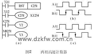 图2中的X12为ON时,C25l通过中断,对X0输入的A相信号和X1输入的B相信号的动作计数。X11为ON时C251被复位,当计数值大于等于设定值时,Y2的线圈通电,若计数值小于设定值,Y2的线圈断电。