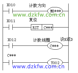 计数器的当前值增加,通过设定值(K或D的内容)时输出触点置位。在减少方向上通过设定值复位。