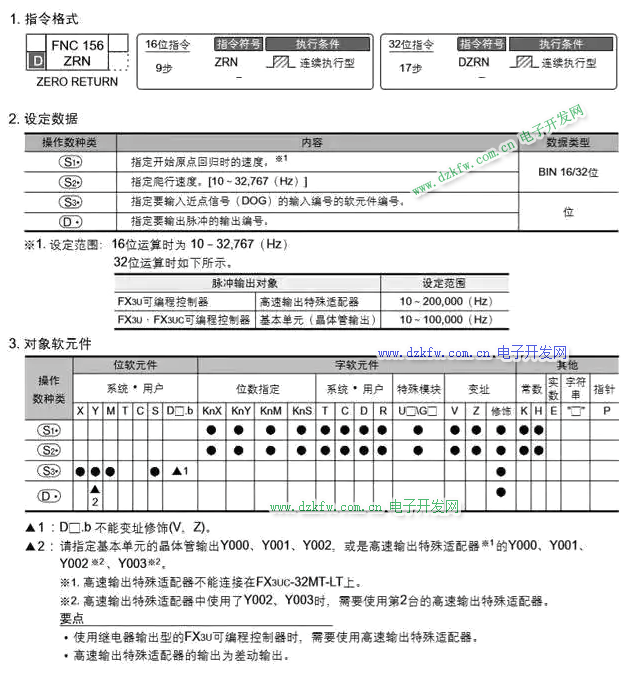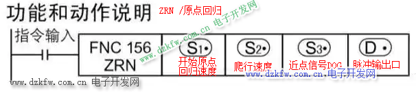 该指令是PLC与伺服驱动器配合工作时,用指定脉冲速度和脉冲输出端口,让执行机构向动作原点(DOG)移动,直到遇到原点信号满足条件为止。