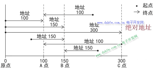 所谓的绝对方式就是以原点为基准指定位置(绝对地址)进行定位,起点在哪里都没有关系,就是说与现在我停在哪地方无关,只与原点做比较,比如我现在在100的位置,我们输入100,是不会动的,输入500,会向前走400,输入-500,会向后退600,因为只和原点做比较,现在在100的位置,输入100与原点比较无变化,输入500,源原点做比较还差400,所以往前走400,输入-500,与原点比较,发现不仅要走100回到原点还要往回再走500加起来就是600。