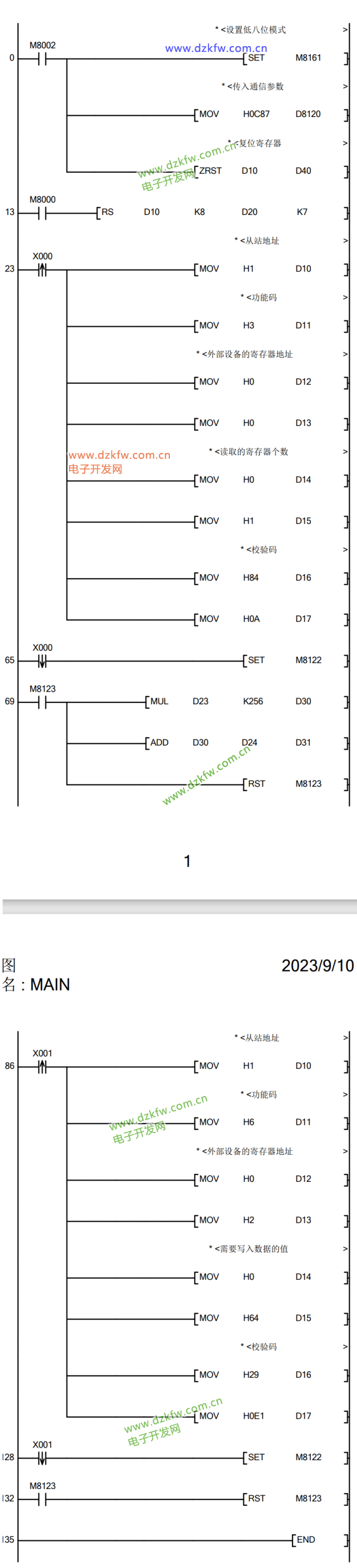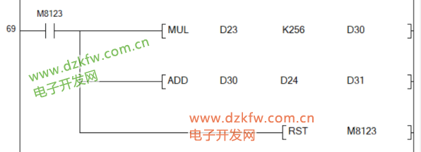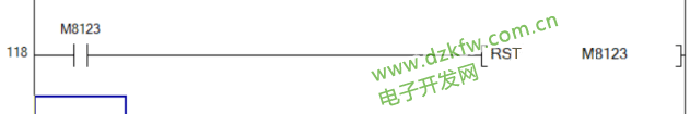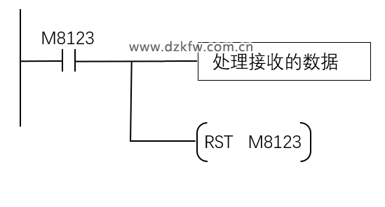 RS指令将数据发送完成后,进入接收数据状态。此时M8123被置位为ON,并对接收到的数据进行处理,数据处理完成后需要将M8123复位为OFF,否则无法接收下一轮的数据。