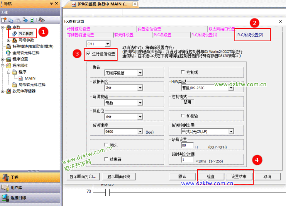 依次单击参数列表中的“PLC参数”→“PLC系统设置2” →勾选“进行通信设置”,然后根据实际需求设置通信参数,设置完成并检查无误后单击“设置结束”按钮保存设置。