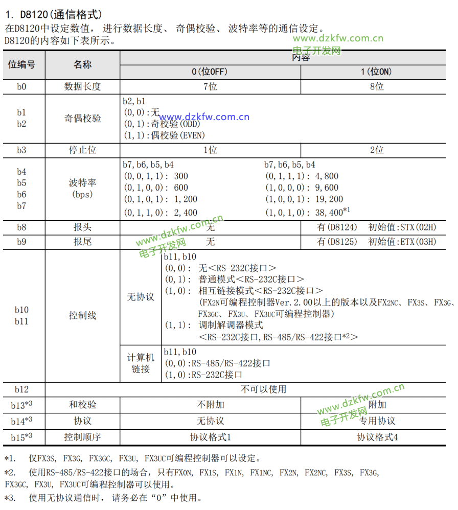根据下表给定的参数并结合实际需求设置b0~b15的值,并转换成十六进制数传送给D8120,实现通信参数设置。