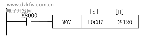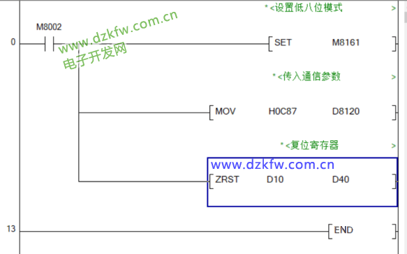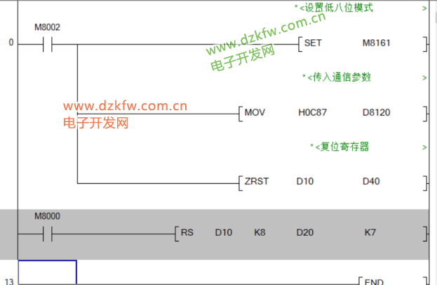 在初始化程序中需要将M8161设置为处理低8位数据模式(M8161=ON),将通信参数传入特殊寄存器D8120以及复位程序中用到的寄存器。