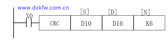在低8位模式下(M8161=ON),当X0为ON时CRC指令计算出D10~D15六个寄存器产生的效验码,并将计算结果的高八位存入D16,低八位存入D17。
