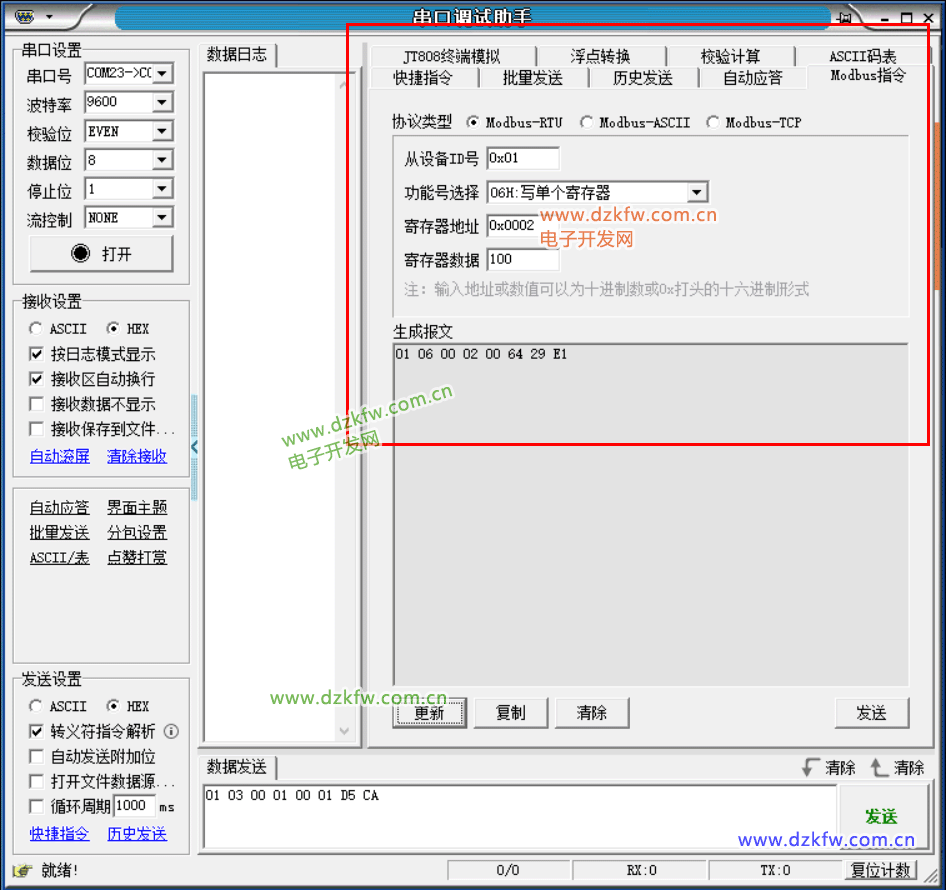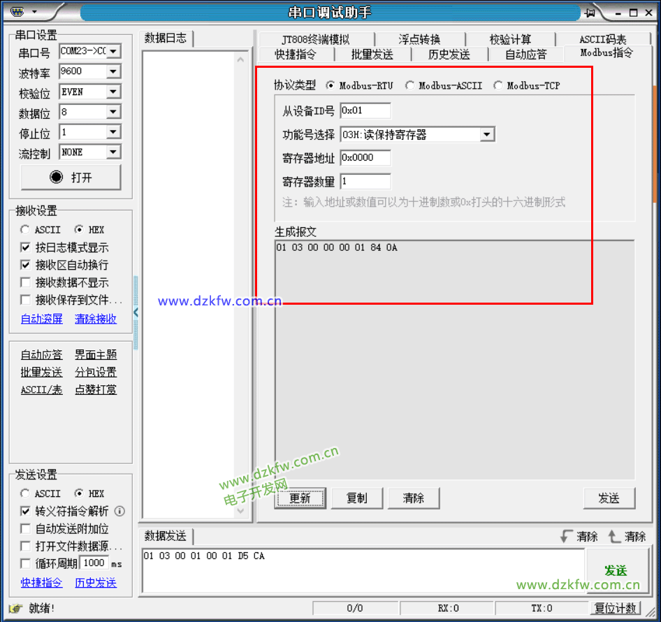 可以借助串口调试助手自动生成报文,其中84 0A为CRC校验码。