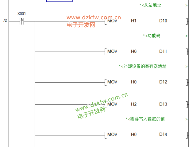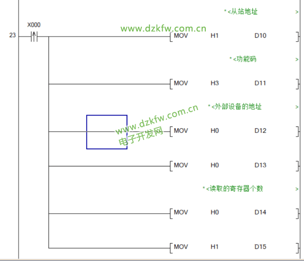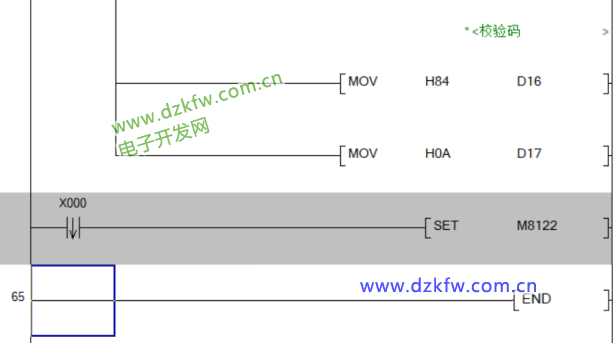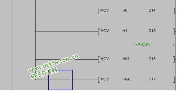 当检测到X0的上升沿时将生成的报文传入用来发送数据的寄存器D10~D15中。