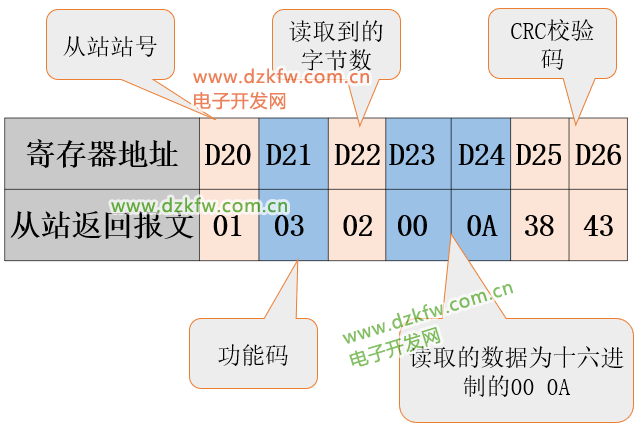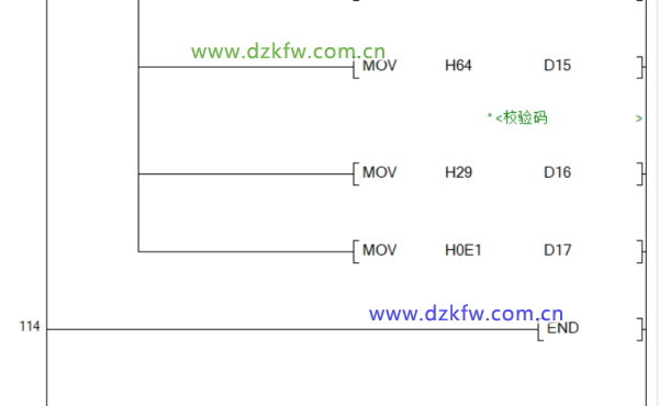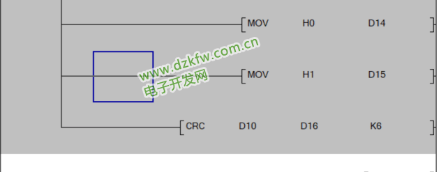 CRC指令将根据前六个报文计算出校验码,并将结果的高八位存入D16,低八位存入D17。