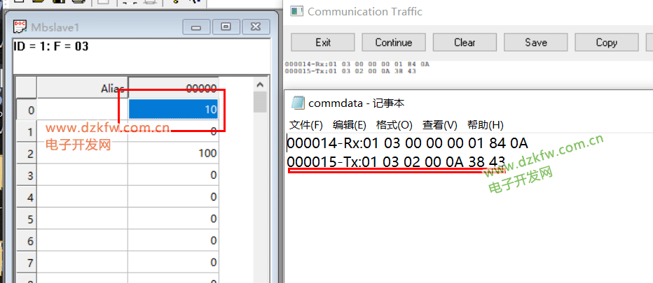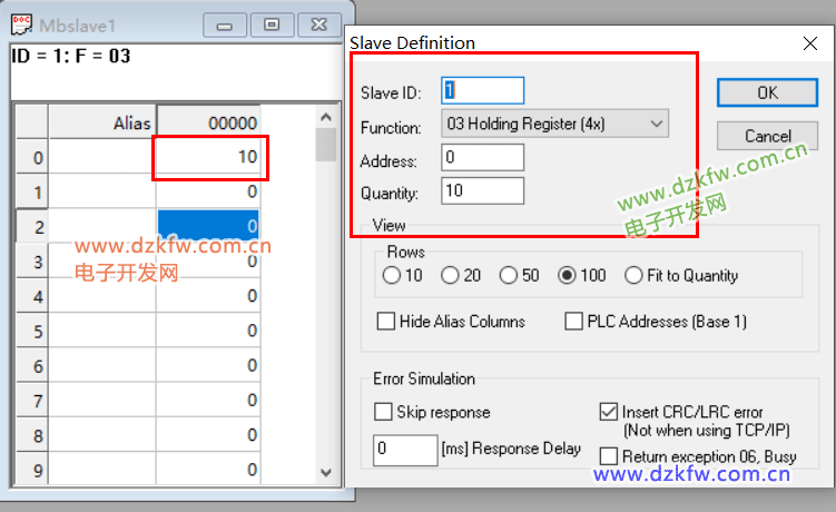单击仿真器中的X1按钮,观察100是否被写入到从站的保持寄存器40002中。