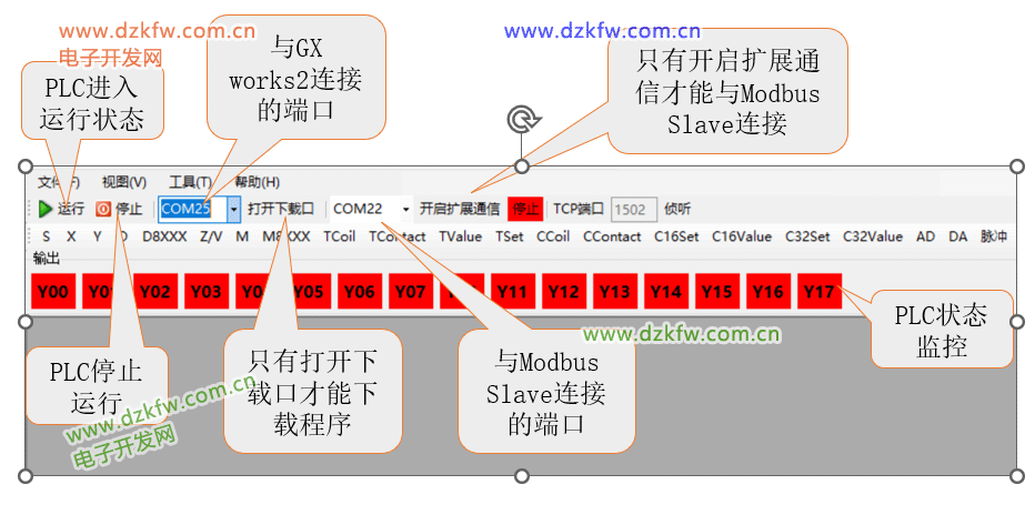 配置完成后需要打开下载口和开启扩展通信,并让PLC处于运行状态。
