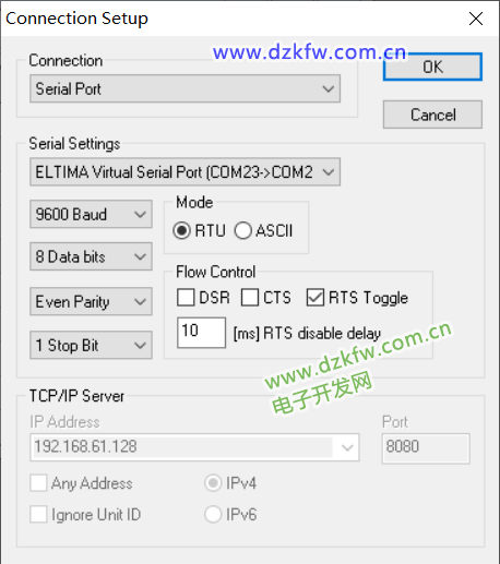 将通信参数设置按如下要求进行设置:数据长度为8位、偶校验、停止位为1位、波特率为9600、无报头报尾,控制线为无协议的RS-485接口。