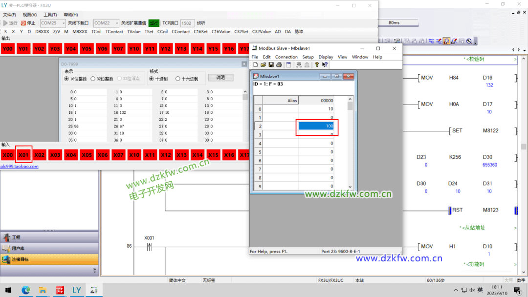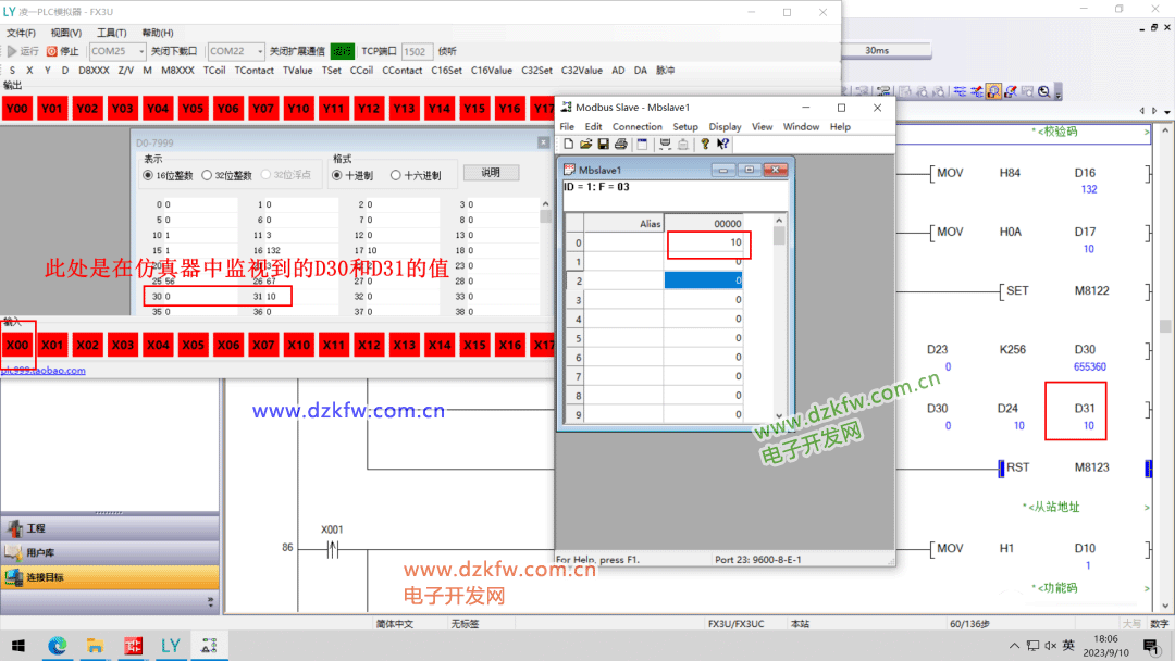 单击仿真器中的X0按钮,观察D31的值是否与Modbus Slave中保持寄存器40000设置的值一致。