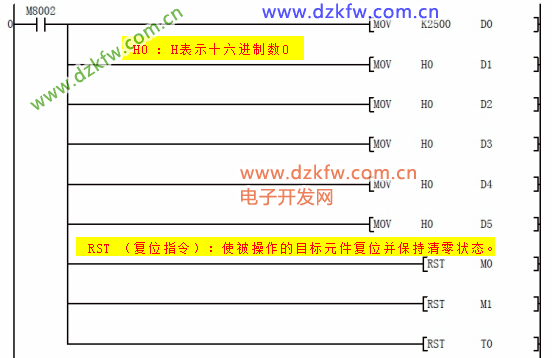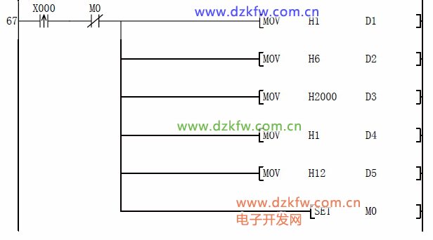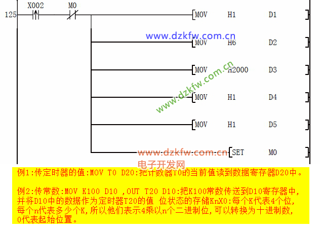 D5:写频率寄存器数据,先给D0 预写想要的频率值后,然后按下X3 即可把预想的频率写入变频器,比如预想写如 21.22HZ的话,那么应该首先给 D0赋值 K2122,然后按下 X3即可写入频率