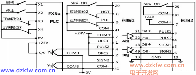这里用到了主伺服驱动器的分频脉冲输出功能,主伺服驱动器用差分电路输出A/B相脉冲信号,给到副伺服驱动器,副伺服驱动器脉冲信号采用集电极开路方式输入。副伺服驱动器还可以采用高速脉冲输入(差分信号输入)的方式。