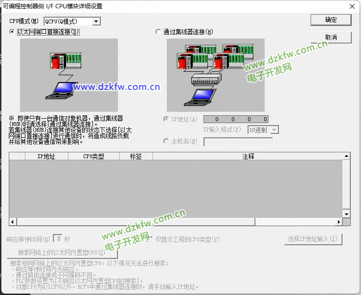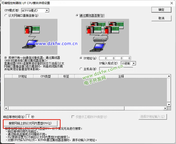 另一种是通过集线器,也就是交换机进行连接,这里需要设置IP地址,要和CPU内置以太网口的IP一致,这里可以通过搜索网络上的以太网内置型PLC进行查找,会显示出IP地址;