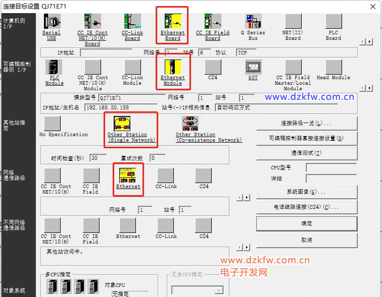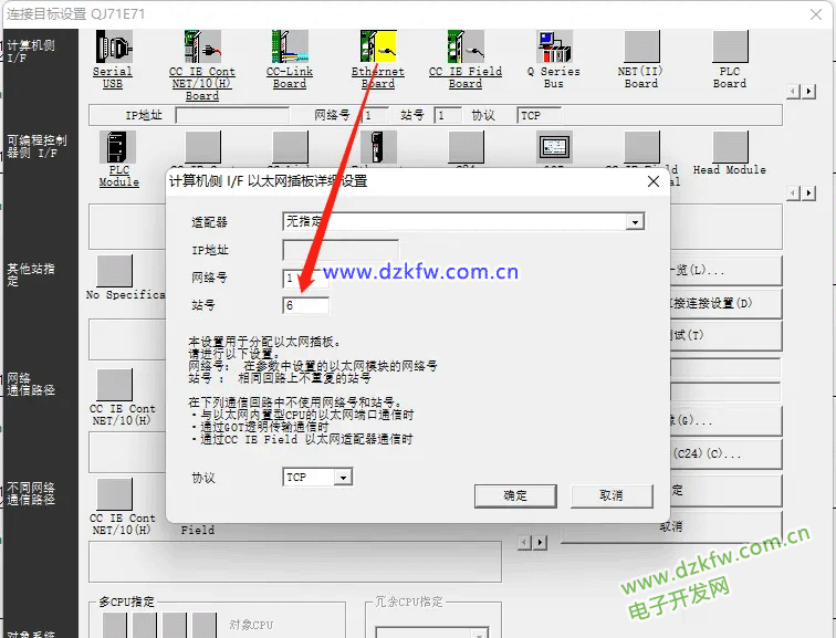 点击计算机侧的连接方式Ethernet Board,设置网络号和站号,网络号和以太网模块一致,站号与以太网模块不一致。