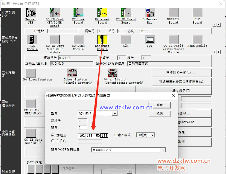可编程控制器侧,选择Ethernet Module,设置站号、IP地址,这里的站号要与以太网模块的站号一致。