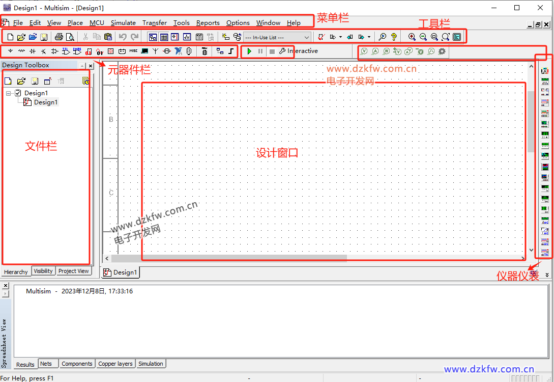 元器件栏和仪器仪表栏是重点。绿色箭头是仿真。