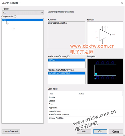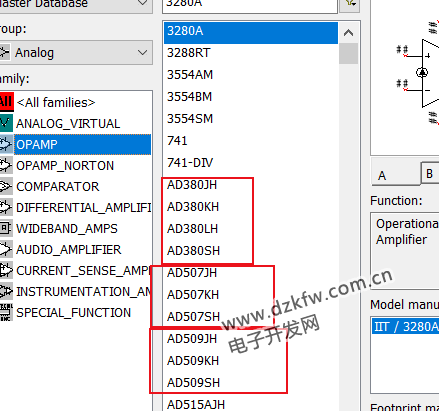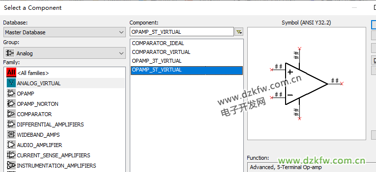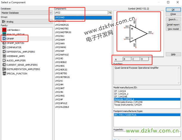 在弹出的“Select a Component”窗口中,点击“OPAMP”,并选择恰当的器件(这里我们以LM324AD为例),最后点击“OK”。