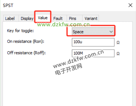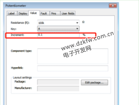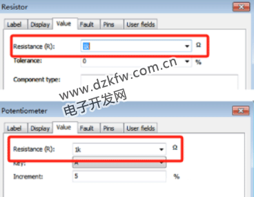 左双击电位器图标,在弹出的“Potentiometer”窗口中点击“Value”选项卡,在“Increment:”后填写新的调节精度,最后点击“OK”。