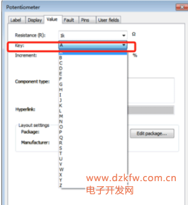 左双击电位器图标,在弹出的“Potentiometer”窗口中点击“Value”选项卡,在“Key:”后面的下拉菜单中选择快捷键,最后点击“OK”。