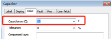 左双击元器件的图标,在弹出的窗口中点击“Value”选项卡,在“ Capacitance(C) :”后填写新的电容量,最后点击“OK”。