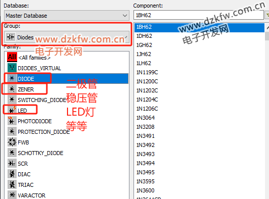 哪个元件库?哪个分组(其实就是刚才的那些元器件分类)?库里的哪类器件?