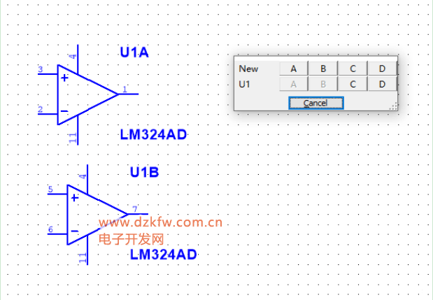 集成运放选择窗口再次跳出。点击“U1”后面的字母,可以选择在电路图图纸上放置标志符为“U1”的LM324AD中的其它集成运放。若点击“New”后面的字母,则可放置新的LM324AD中的集成运放。如果不需要放置更多的集成运放,点击“Cancel”关闭窗口。