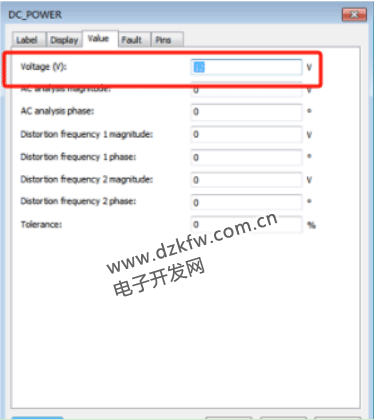 左双击直电压源图标,在弹出的“DC_POWER”窗口中点击“Value”选项卡,在“Voltage(V):”后填写新的电压值,最后点击“OK”