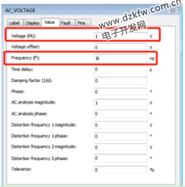 左双击交流电压源图标,在弹出的“AC_VOLTAGE”窗口中点击“Value”选项卡,在“Voltage(Pk):”后填写新的电压幅值,在“Frequency(F):”后填写新的频率,最后点击“OK”