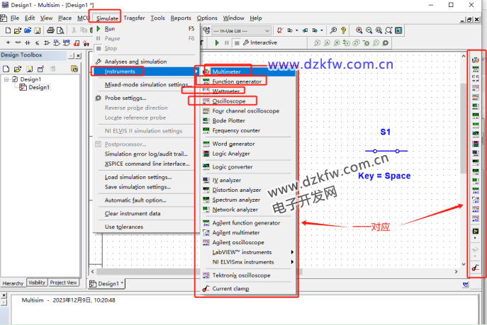 点击菜单栏中的“Simulate” “Instruments” “Multimeter”
