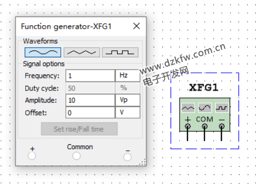 “Waveforms”项中的三个按钮用于选择输出电压的波形,从左到右分别为正弦波、三角波和方波