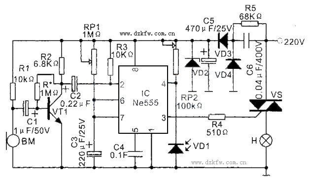 1.当环境亮度大时,光电二极管VD1受到光线的影响,阻值减小,RP2与VD1分压值较低,IC的4脚电压很低,IC被强制复位,此时即使驻极体传声器BM接收到声音,IC的3脚输出低电平。双向晶闸管VS无触发信号,呈截止断开状态,灯泡H不亮。