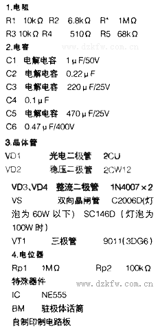 2.天黑时,由于光电二极管VD1不受光照影响。因此阻值增大,IC的4脚电压升高,此时当有声响时,驻极体传声器BM将声音信号转换成电信号,VT1放大加至IC的2脚,使IC的3脚输出端由低电平转为高电平,双向晶闸管VS被触发后导通,灯泡H点亮。声音消失后,整个电路仍处于暂稳态过程,当电容C3上的电压充至IC第6脚的阈值电压时,电容C3通过IC的第7脚放电,整个电路又回到初始状态。IC的暂态工作时间长短决定了灯泡亮的延时长短。可由1.1RC进行估算,调整电位器RP2即可改变灯泡H的延时时间,本电路的参数延时可达4~5分钟。