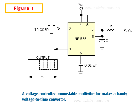 图1 用压控单稳态多谐振荡器制作便捷的电压-时间转换器。