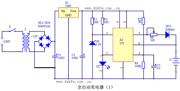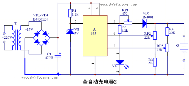 电压比较器由时基电路A2组成,在它的控制端5脚接有一个稳压二极管VS(稳定电压5.6V),所以将电路的复位电平定位在5.6V。发光二极管VL为充电指示器。