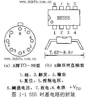 555时基集成块的封装外形图般有两种,一种是做成8脚圆形TO-99型如图i-l(a)所示;另种是8脚双列直插式封装,如图i-l(b)所示。556双时基集成块内含两个相同的时基电路,其封装外形如图1一2所示,是双列直插14脚封装。