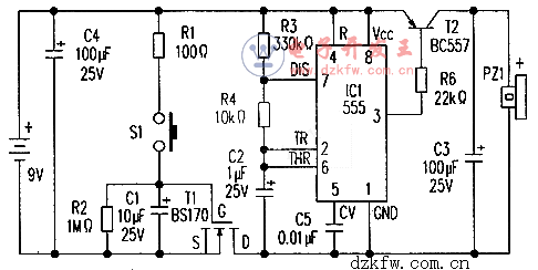 定时电路工作过程如下:短促按压开关S1使电容C1经R1迅速充电。当C1两端的电压超过场效应晶体管T1的栅极门限电压时,T1开始导通,而且只要C1上的电荷使电压大于此门限电压.这种导通状态就会一直维持下去。如采用电路中所用的元件值,蜂鸣器大约鸣叫15秒,且其鸣叫声十分悦耳。这一时间足以让主人听到。