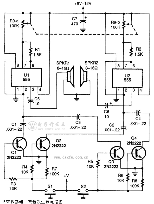 两个555振荡器或定时器都可以配置成音频振荡器,分别用于单独的扬声器。一个双100kQ电位计用于同时调谐这两个振荡器。振荡器的频率范围受一个平行晶体管开关控制,这个开关为振荡器选择定时电容。虽然这个电路只给出了两个范围的开关电路,实际上,只要复制一下这个平行晶体管开关电路,就能添加许多开关电路。