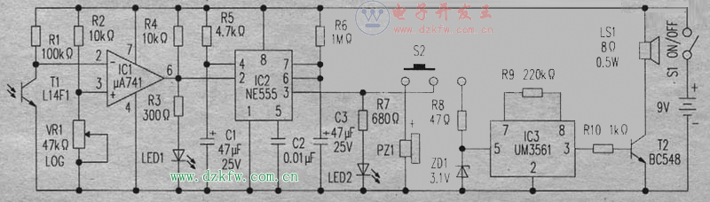 在有环境光线照射时,T1导通,Ic1的②脚电压低于③脚电压,这时IC1的输出为高电位,使LED1发光,表示一切正常。