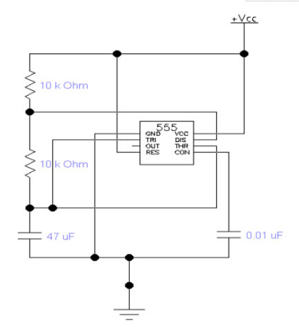 无稳态工作模式下555定时器可输出连续的特定频率的方波。电阻R1接在VCC与放电引脚(引脚7)之间,另一个电阻(R2)接在引脚7与触发引脚(引脚2)之间,引脚2与阈值引脚(引脚6)短接。工作时电容通过R1与R2充电至2/3VCC,然后输出电压翻转,电容通过R2放电至1/3VCC,之后电容重新充电,输出电压再次翻转。