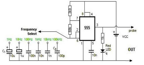 这是一个无线电信号线路和电视的最有用的方波发生器项目。方波是最适合用于测试信号的中频(IF)地带,将通过中频变压器没有任何衰减,不管是什么电路的调谐频率。555TImer是配置非稳态运行,这意味着它将触发本身作为一个多谐振荡器自由运行。计时元件电阻R1,R2和电容器(C1-6)在此图中显示的值,产生的六个频率1Hz的,10HZ,100HZ,1KHZ,如果你想产生一个可变频率10kHz到100kHz您可以用一个100K的迷你系列10K电阻微调电位连接,68K电阻。这方波振荡器的电子项目,可提供5至18伏直流输出电压从电源供电,但通常建议使用9伏直流电源。